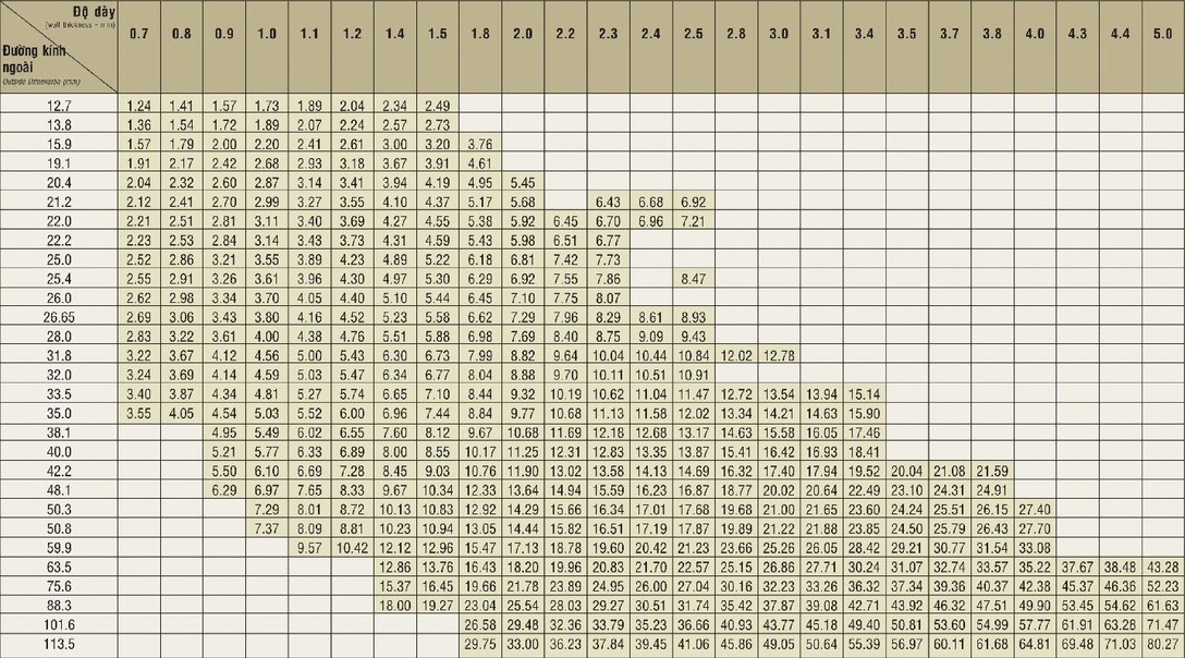 Bảng tra kích thước, trọng lượng thép ống đen Việt Đức